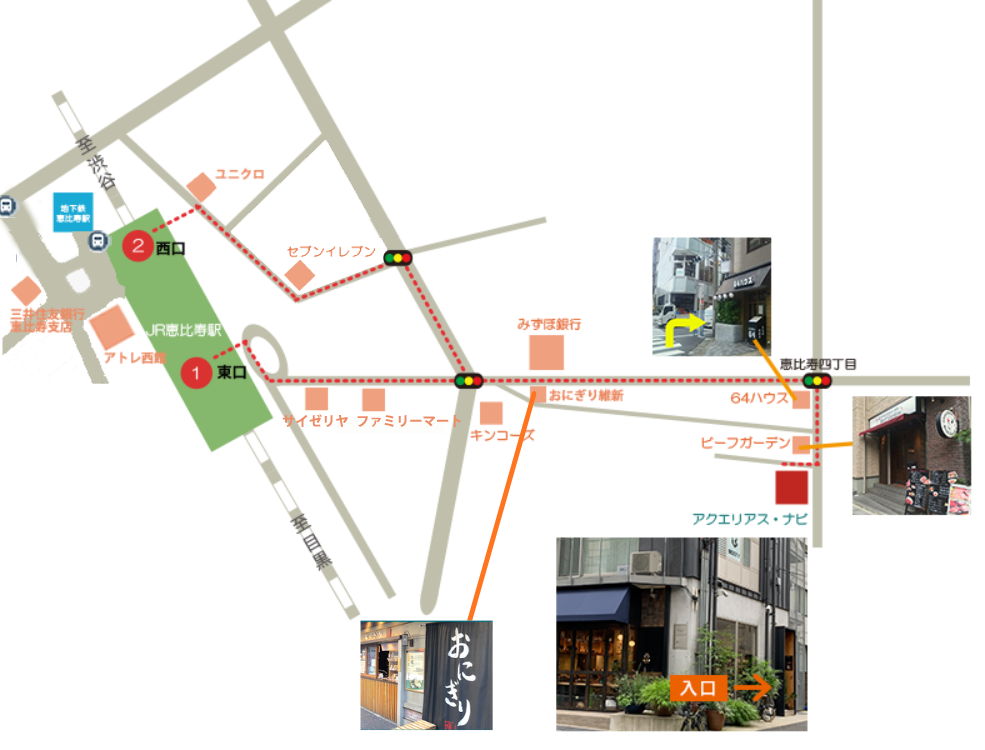 4.恵比寿駅東口の信号を「おにぎり維新」の方向へ渡り、大通りを直進します。